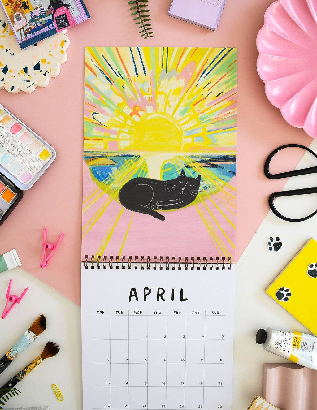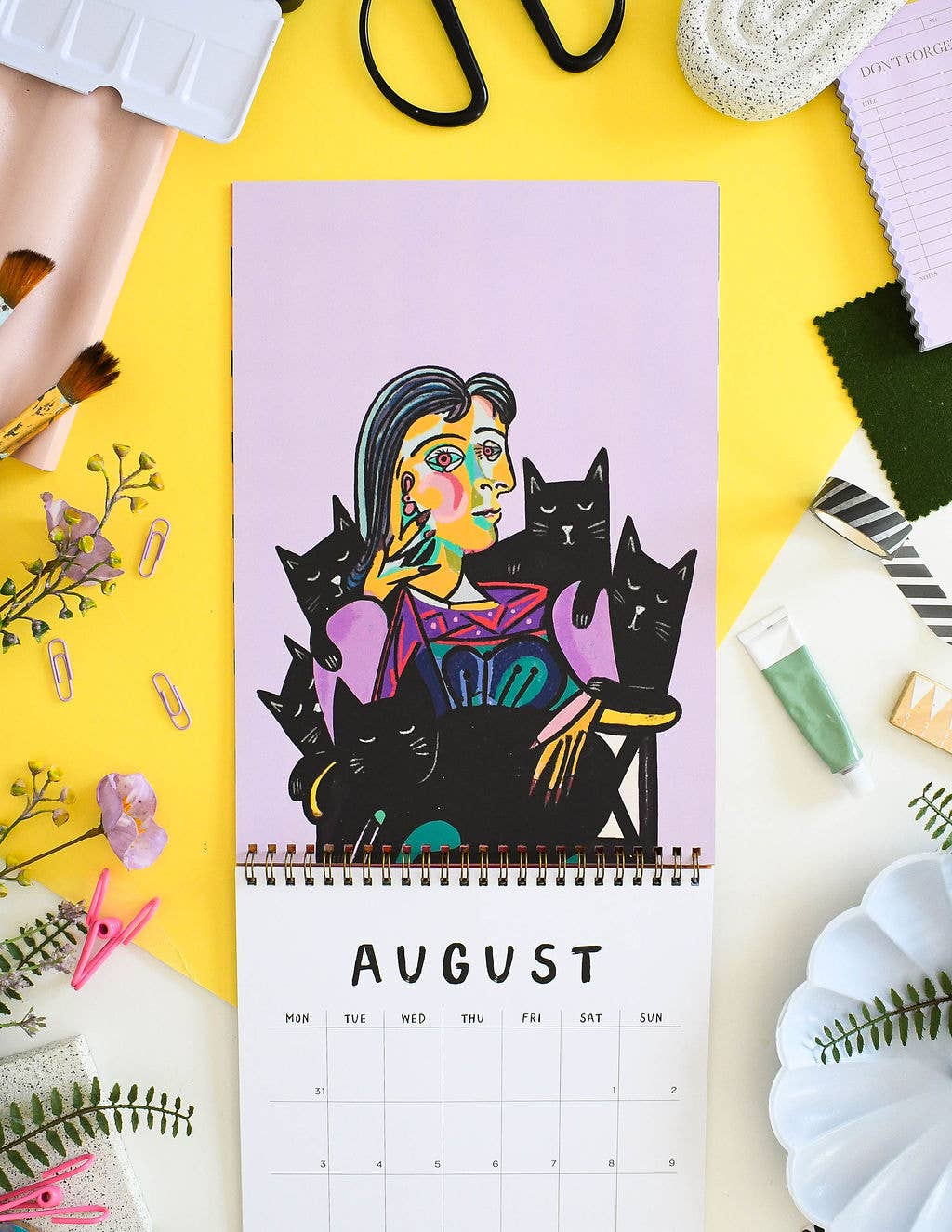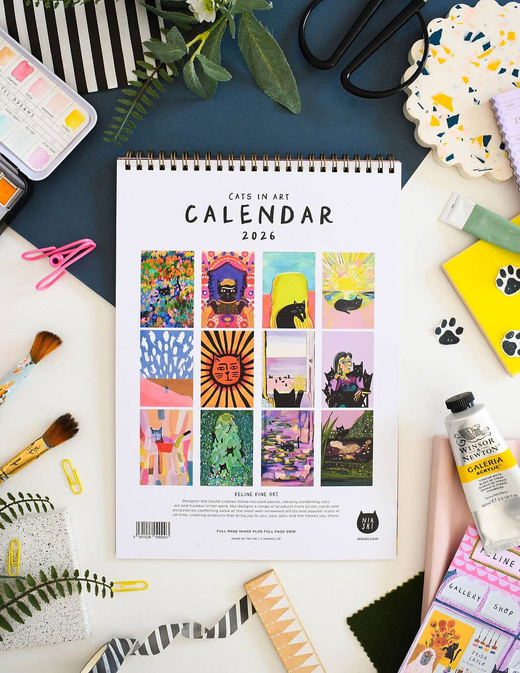A beautifully illustrated calendar with each month featuring an illustration based on the artwork of some of our most loved artists with a little feline addition. Including work inspired by artists such as: Frida Kahlo , Henri Matisse, Edvard Munch. Calendar Details: A4 in size (21 x 29.7cm) folding out with an image on one page and A4 calendar grid Copper spiral bound, suitable for wall hanging *please note that this calendar ships worldwide and therefore the grid is blank and doesn’t contain any holidays specific to your country* 350gsm Digitally printed, with a matte finish Double sided pages (more environmentally friendly!) Each month has a enough room in the squares to see what day a date falls and to write down super awesome cat plans. Packaged in a hard backed envelope.