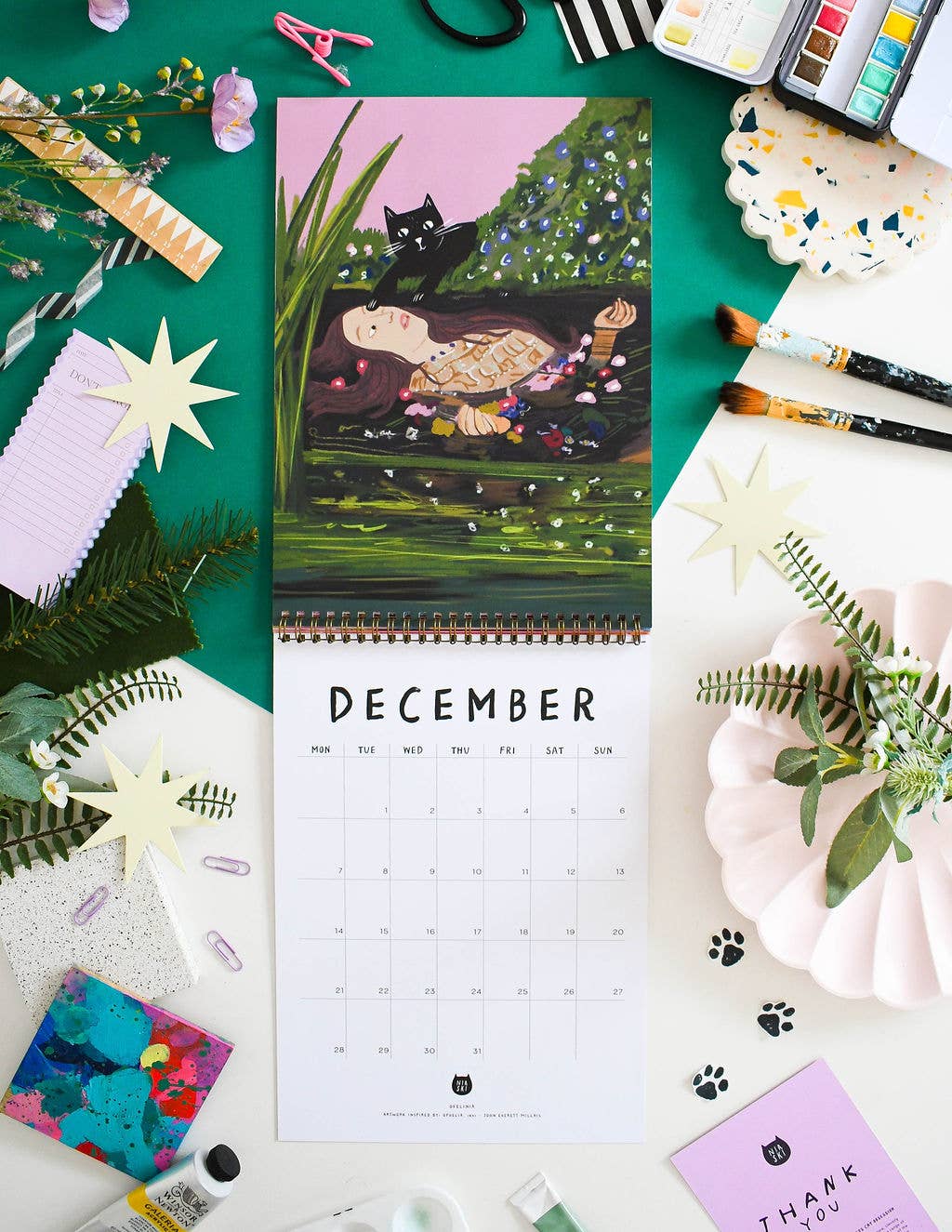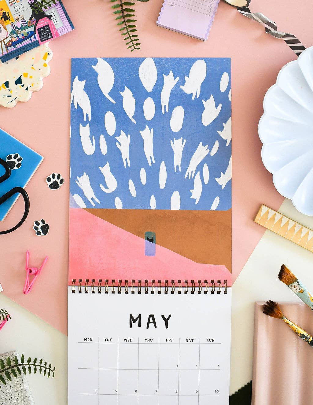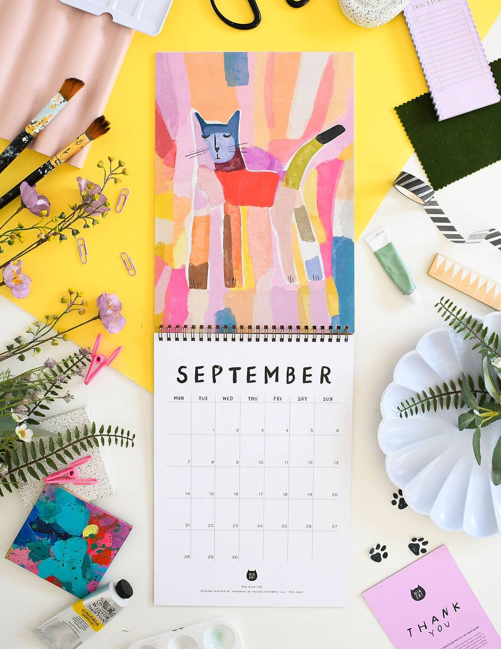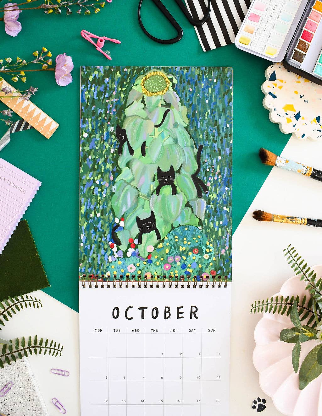 A beautifully illustrated calendar with each month featuring an illustration based on the artwork of some of our most loved artists with a little feline addition. Including work inspired by artists such as: Frida Kahlo , Henri Matisse, Edvard Munch. Calendar Details: A4 in size (21 x 29.7cm) folding out with an image on one page and A4 calendar grid Copper spiral bound, suitable for wall hanging *please note that this calendar ships worldwide and therefore the grid is blank and doesn’t contain any holidays specific to your country* 350gsm Digitally printed, with a matte finish Double sided pages (more environmentally friendly!) Each month has a enough room in the squares to see what day a date falls and to write down super awesome cat plans. Packaged in a hard backed envelope.